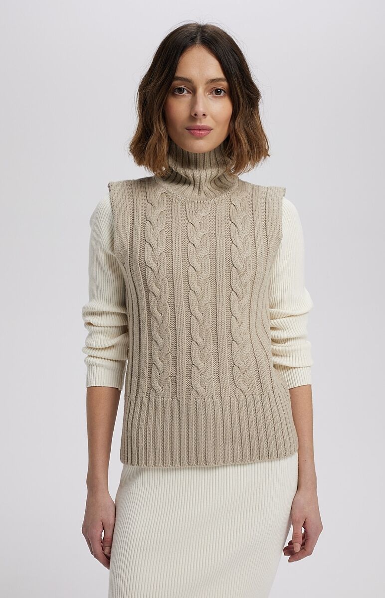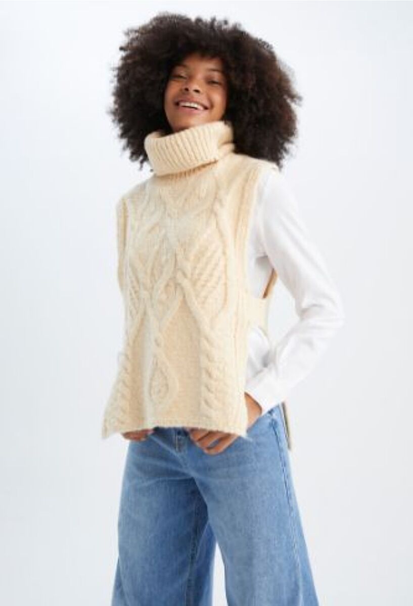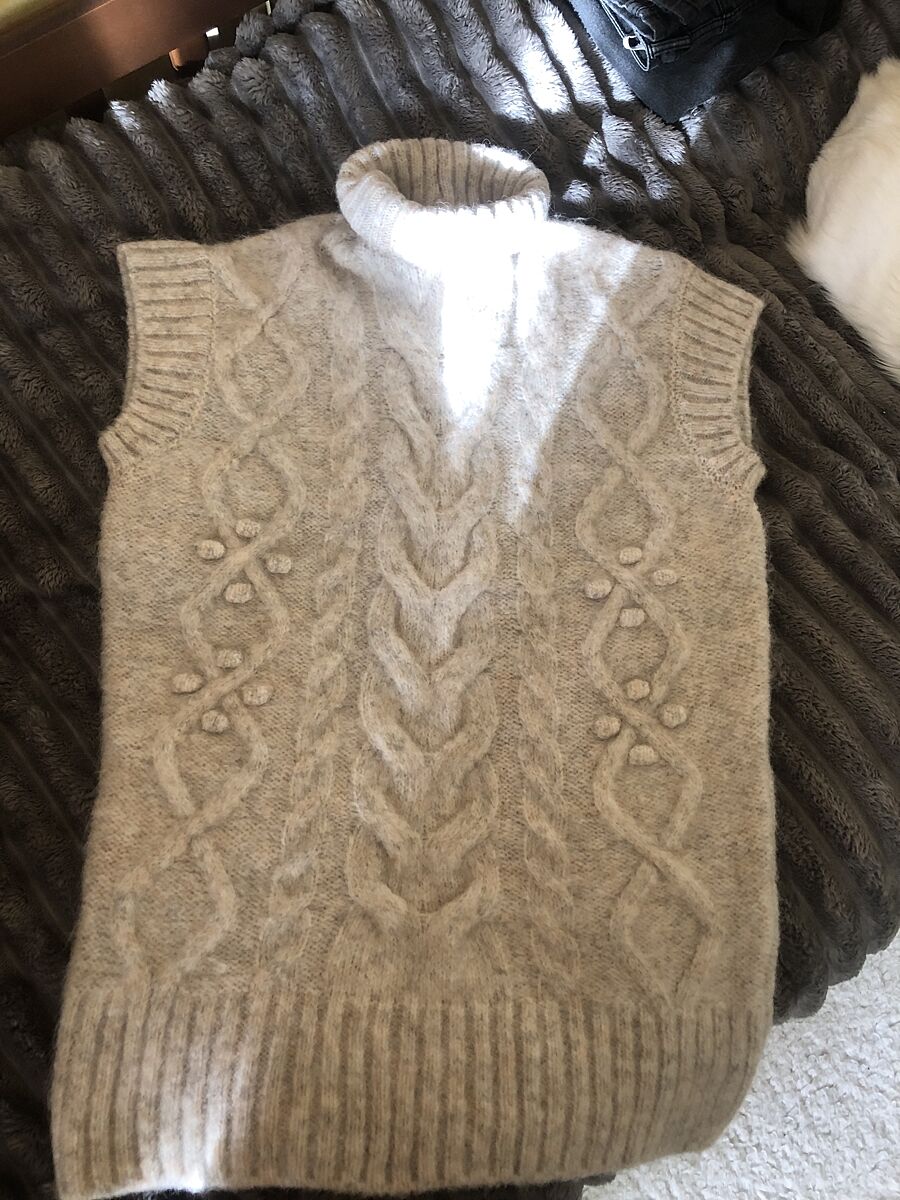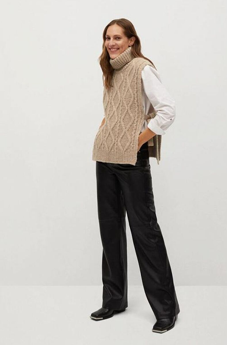 Сейчас, во второй половине апреля, как никогда важно и интересно стилизовать эту вязанную безрукавку с бусинками и воротником-хомутом...