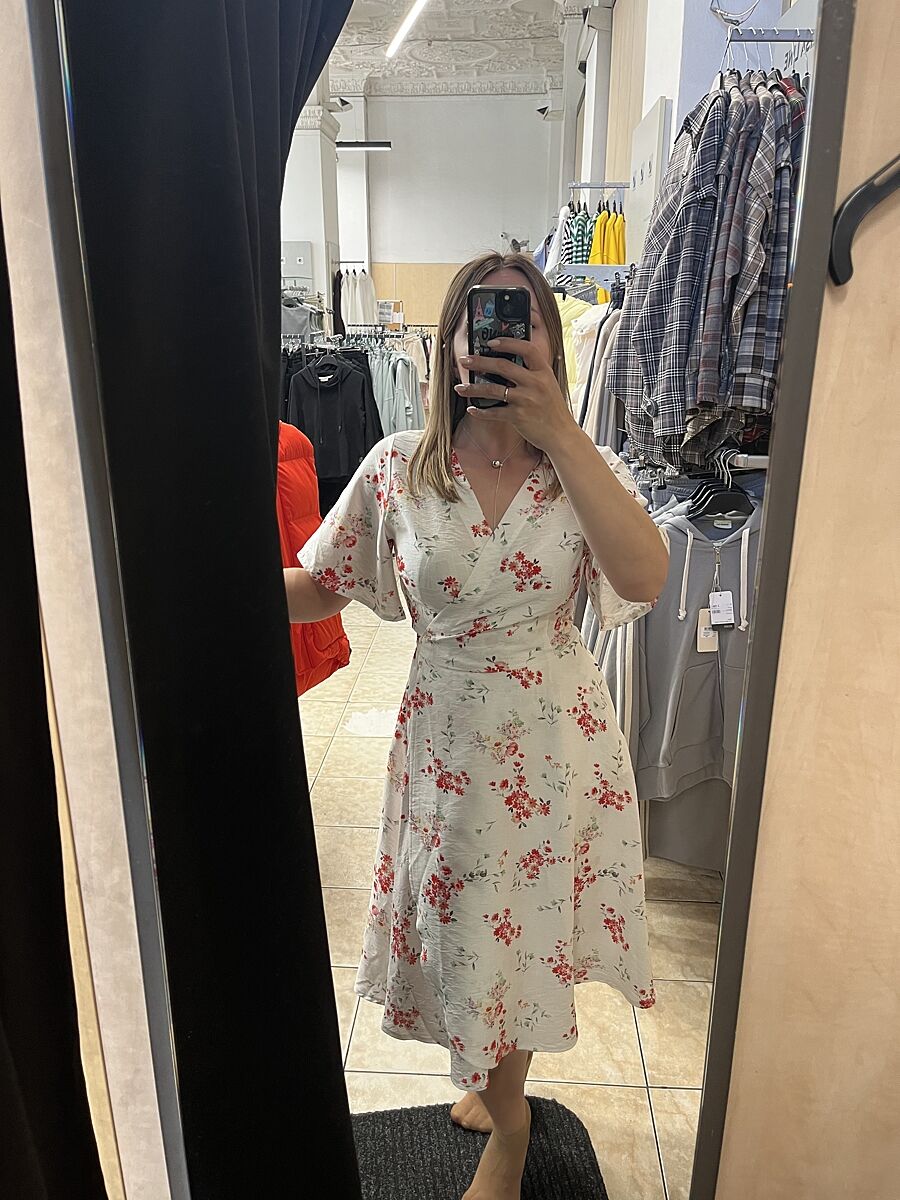 Если платье на запах, то оно должно быть длиннее. А такая несуразная длина делает бедра шире, а ноги короче