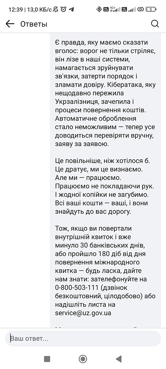 Повертала квитки 17 березня, досі не прийшли кошти. Написано впродовж 30 банківських днів, але ніколи не було такого, щоб в останній момент поверталися. На гарячій лінії ніхто не відповідає, на пошту пишу, прикріплюю бланк повернення, лист висить в не відправлених, скринька їх не приймає листи...