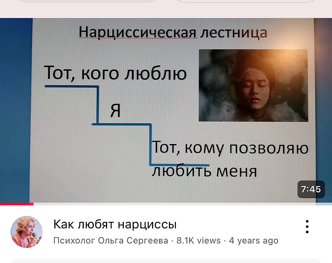 Дякую, знайшла відео. Я підозрюю, що я нарцисична і закохуюсь в нарцисів.