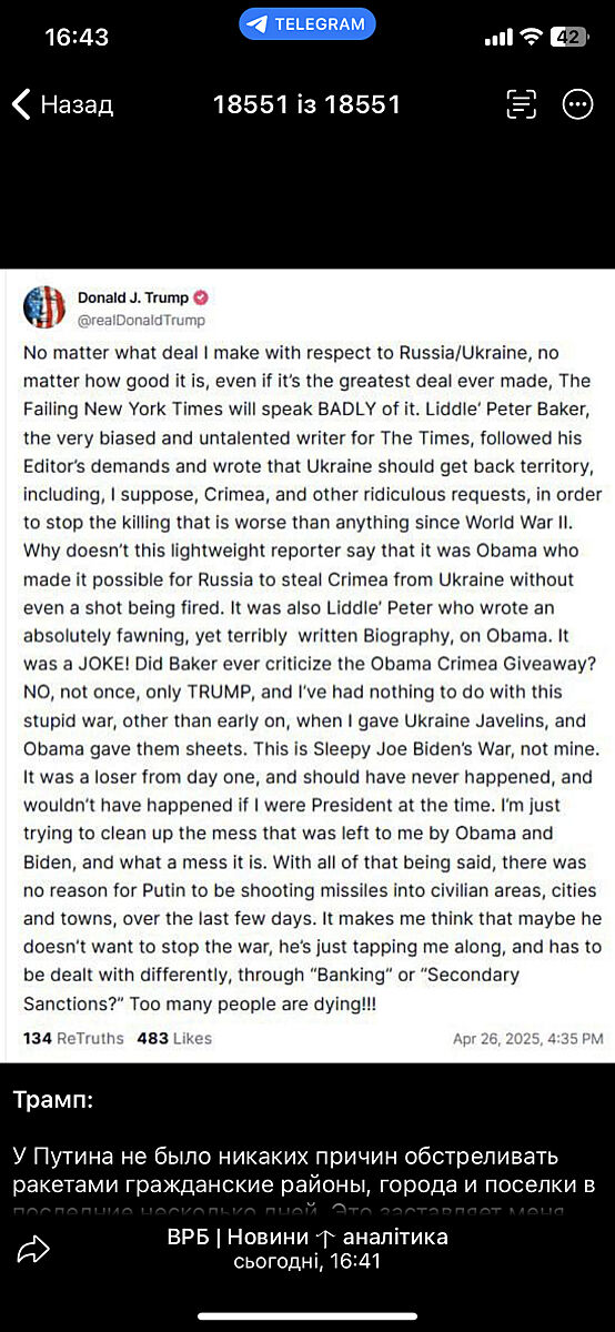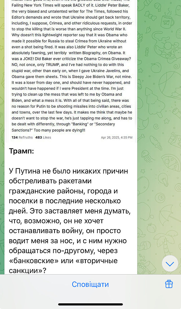 ’Більшість ключових пунктів уже погоджено’, - написав Трамп у Truth Social, та закликав ’припинити кровопролиття ЗАРАЗ’.
