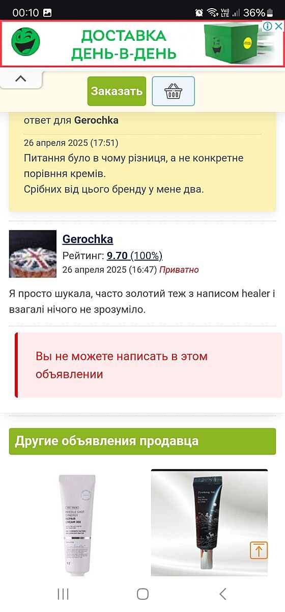 Всім привіт! Дивна ситуація, у мене таке вперше за 15 років на кідстафі, навіть не одразу зрозуміла, що сталося) Обирала собі корейську косметику, задала продавцю питання. У відповідь отримала, як на мене, відверте хамство. Поки все-таки шукала інформацію про креми в інтернеті, виявила, що не можу більше писати під оголошенням. Замовлення теж не можу у неї оформити. Шкода, мені подобався її асортимент, хотіла замовляти в подальшому. Переписка на скрінах. В чому я була не права і чим я так завинила перед продавцем?