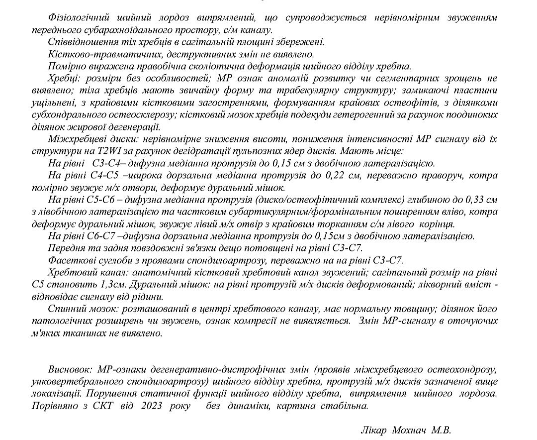 Протрузія на рівні С5-С6 середня - 0,33 см (тобто 3,3 мм). Сердння протрузія в діапазоні від 3 до 5 мм. І ця протрузія за даними МРТ ШВХ деформує дуральний мішок, звужує лівий міжхребцевий отвір з крайовим торканням с/м лівого корінця. Можливо, і з цією протрузією пов´язано, що при повертанні голови може відбуватися перетискання (компресійний вплив) на хребтові артерії (синдром хребтової артерії).