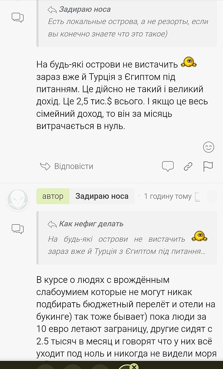 При том что темы часто создают именно реальные люди. Но в комментариях начинается мир розовых единорогов)) Всех мужья на руках носят все 20 лет брака, доходы уровня элиты, на массмаркет все фукают, всё идеально у всех)) Где те люди что сметают умывалки и крема по 50 грн в Еве? Что сметают футболки по 100 грн в сенсей? Они тут не сидят? Я темы не создаю, но заметила что любая тема автора о проблемах превращается в "какможнатакжить!" Я лично не представляю как можно иметь доход выше сотни тысяч и при этом просирать жизнь на форуме, но я же не пишу об этом в каждой теме (стоит об этом написать, так набегут сразу десятки миллионЭрш с оправданиями шо тут они хорошо проводят время и это полезно)))) Напрашивается сразу знаменитая фраза "фантазёр ты меня называла...."