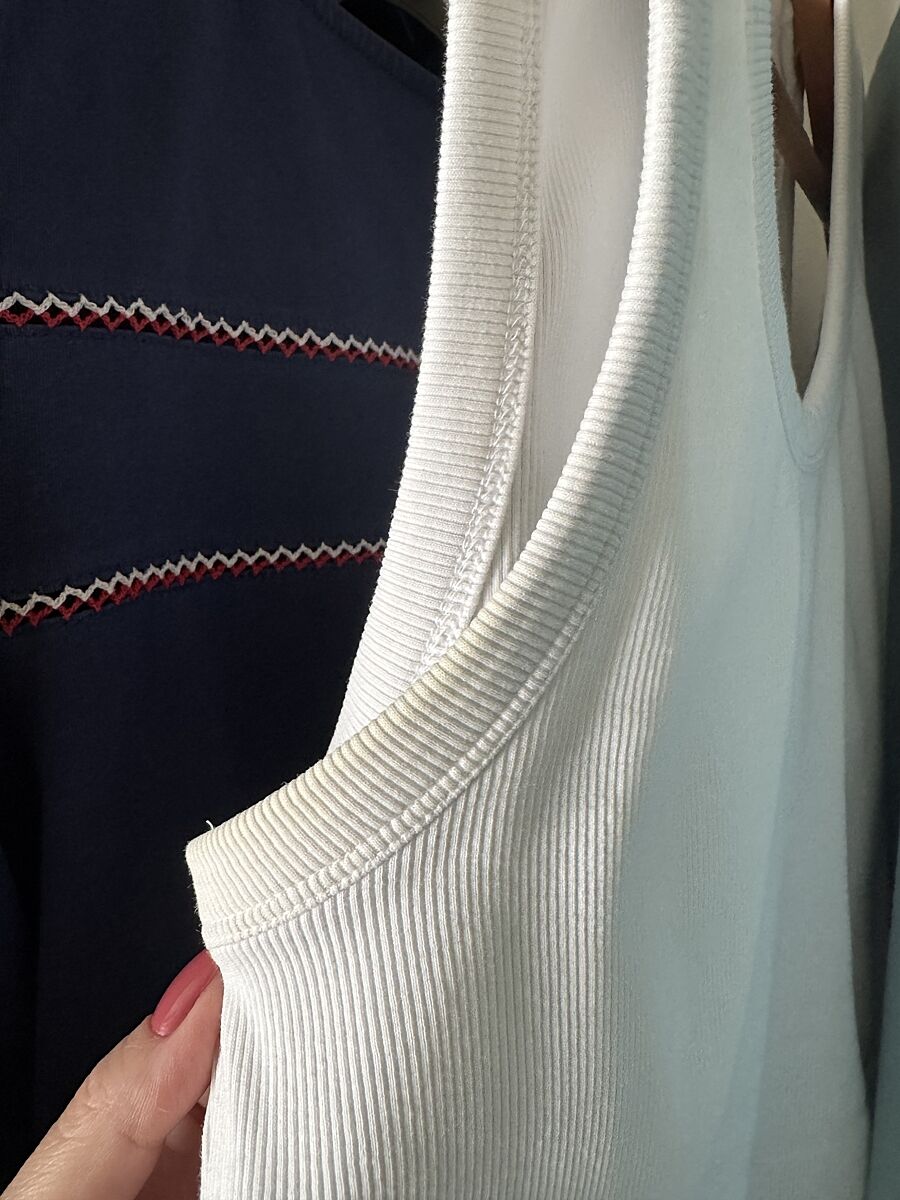 Ну синяя кофта неудачно вышла на фото, телефон откорректировал. Немного полиняла, в целом норм. Белый топ - одно лето относила. Рубашка дорогая, тоже одно лето относила