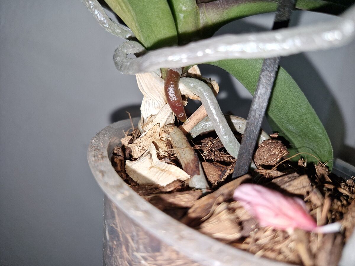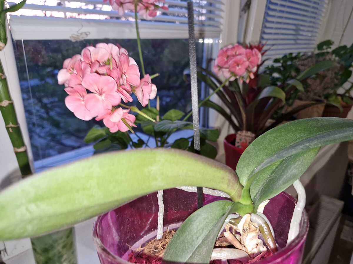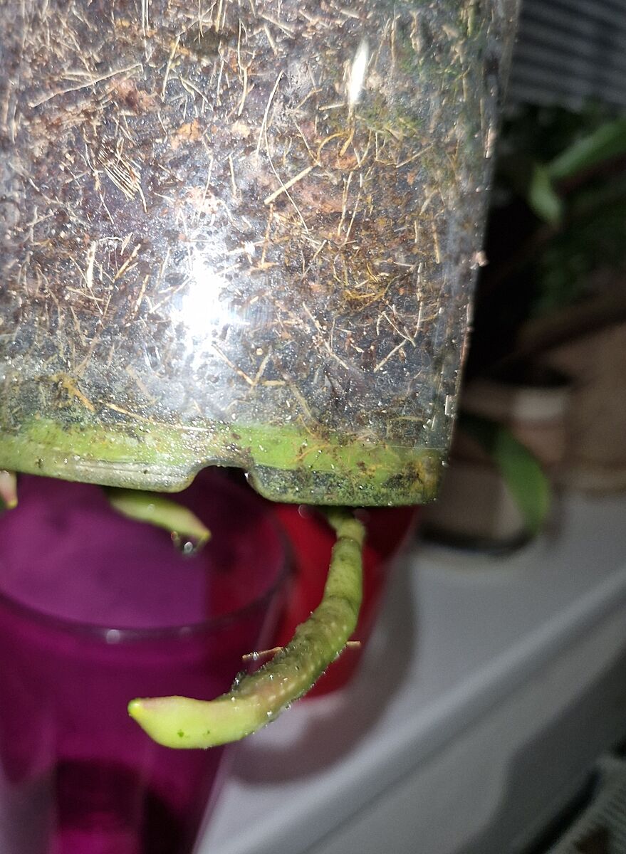 Нет. Корни мощные и жирные. Достала горшочек. Аж вылезли уже. Я не видела. Корней много. Просто сверху, под листьями, что на первых фото - много новых вылезло за последние месяцы. Я их просто в субстрат направляю.
