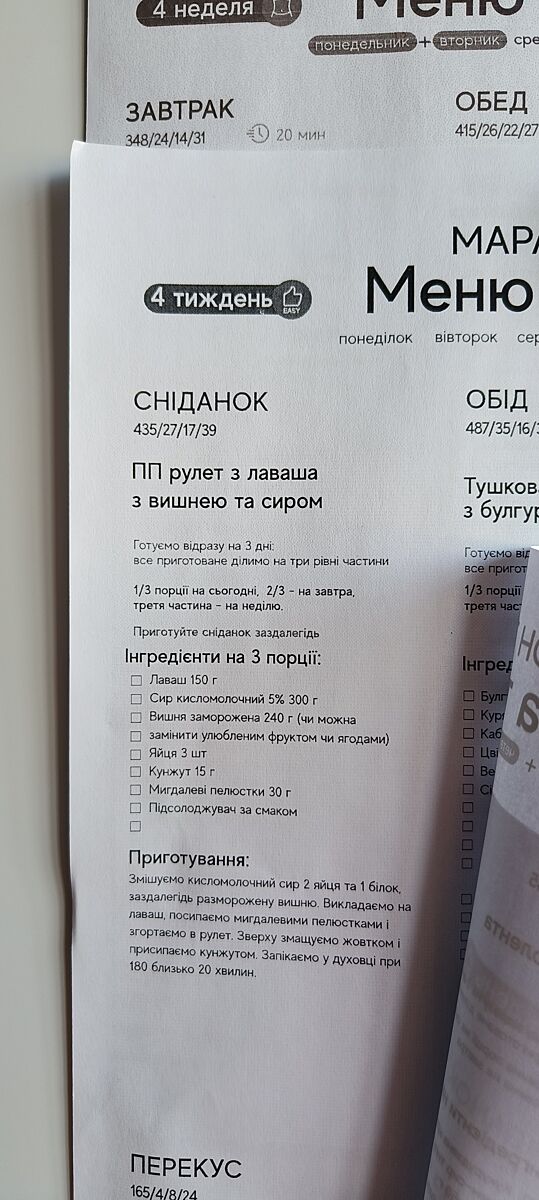 Я теж зараз займаюсь собою. Беру все найтяжче на ранок: тост висівковий (рідко) чи хлібець (намагаюсь без цього бути взагалі) і +яйця, овочі, политі оливковою олією, насіння, зелень, авокадо, замість солодощів - сухофрукти (4 фініка або інжира) до чаю/кави. Якщо не поспішаю, то обожнюю ще щось із свіжих фруктів на сніданок. Попереду цілий день, все переробиться на енергію. На обід риба або мʼясо з овочами і зеленню, якщо дуже хочеться, ложка-дві гречки чи чорного рису, рідко квасоля або чечевиця, гриби. На вечерю сир (творог) або з ягодами, або щось по типу грецького салату, або салат з консервованим тунцем чи печінкою тріски. Обовʼязково мати перекуси: злаковий чи фітнес батончик, горішки, ті ж сухофрукти чи дієтичні хлібці, морква помита і порізана, сельдерей, твердий сир на ура все заходить… головне не доводити себе до дефіциту харчування і дикого голоду, бо організм реагує, починає відкладати запаси, робити дефіцит не в жирі, а в мʼязах! Так ви не прийдете в норму. Памʼятайте про помірне пережовування, не заглотувати те, що взяли в судочку під компʼютер за 2 хв, робіть харчові паузи, їжте повільно!