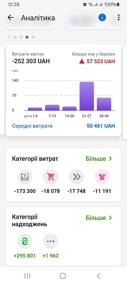З карти чоловіка. В мене ще чоловік є. До його карти в мене доступу немає. Але там немає витрат твх, що у мене є. Топливо у чоловіка службова, я їду з ним на роботу і з роботи. Англ и спорт 4 тис. У чоловіка немає великих витрат, ті гроші ідуть на покупку валюти і відпочинок.