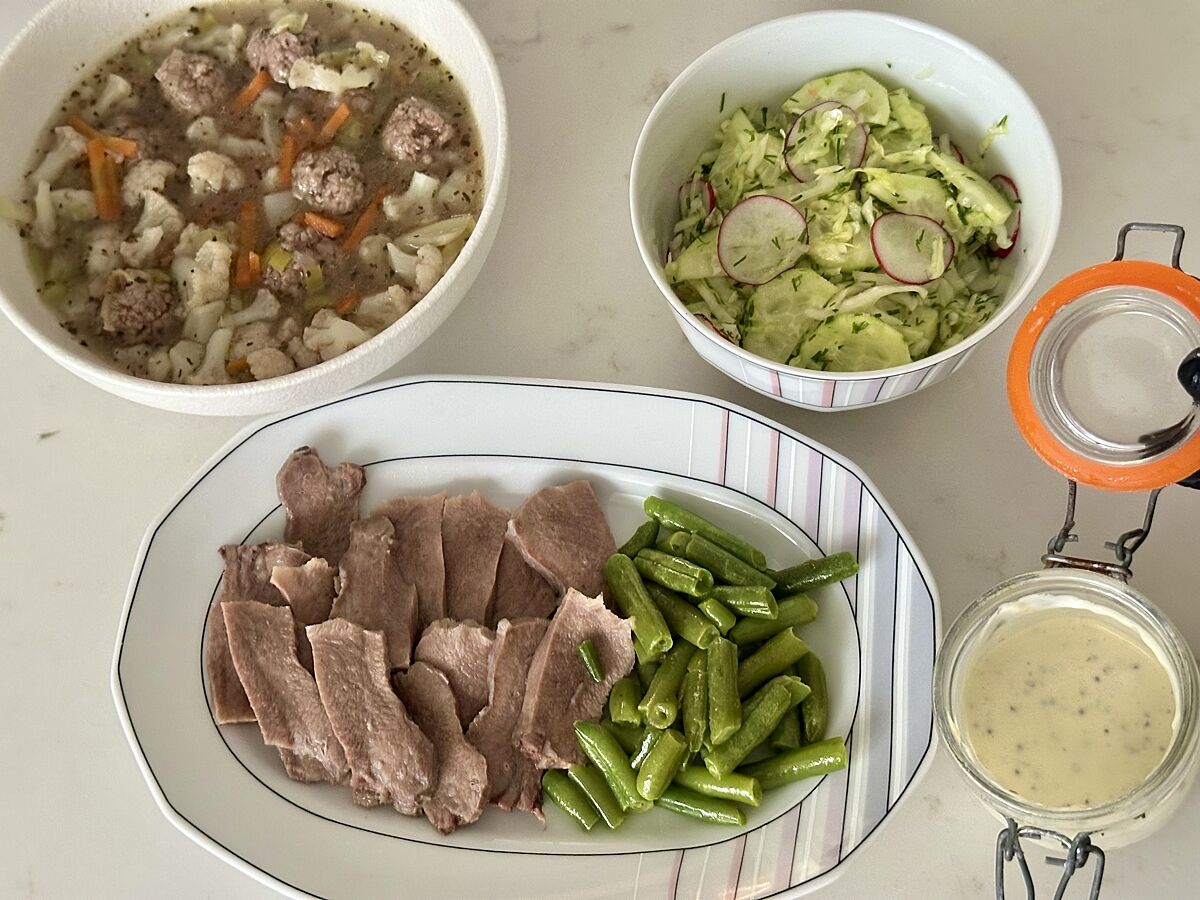 В мене рис, куряча грудка, салат з тунцем, овочевий салат