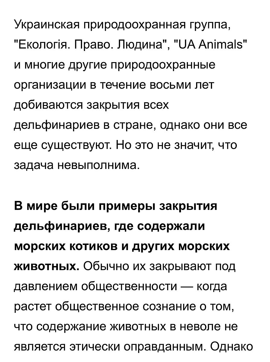 Недопустимо держать в дельфинариях и других животных — морских котиков. В апреле мы узнали, что Одесский дельфинарий ’Немо’ приносит морских котиков в номера своей гостиницы, где посетители могут делать с ними все, что вздумается. Ситуация получила широкую огласку, зоозащитники, в том числе организация ’UAnimals’, обратились в Нацполицию, заявив о жестоком обращении с животными.