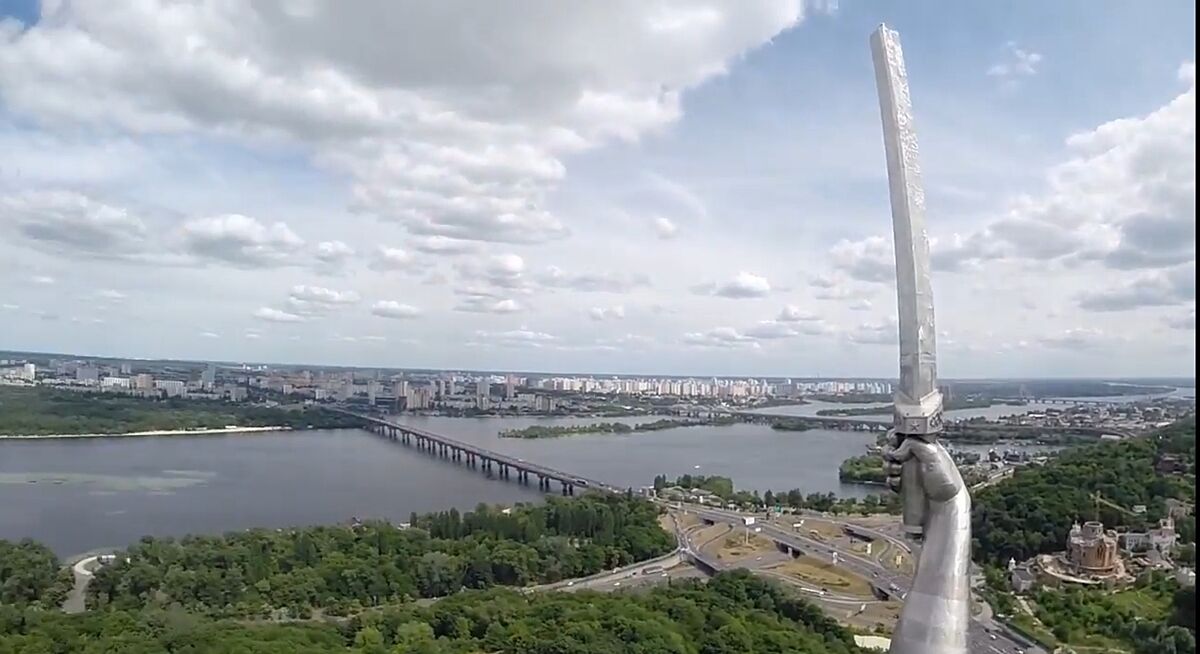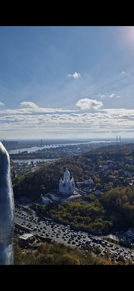 Нічого він не закриває,якщо ви підіймаєтесь на щит..Закриває,якщо ви піднімаєтесь лише до оглядового майданчика,який за щитом.Там дійсно ви майже не бачите Лівого берега.Від оглядового майданчика треба піднятись по драбині на верх щита,і відкривається огляд на всі 360°