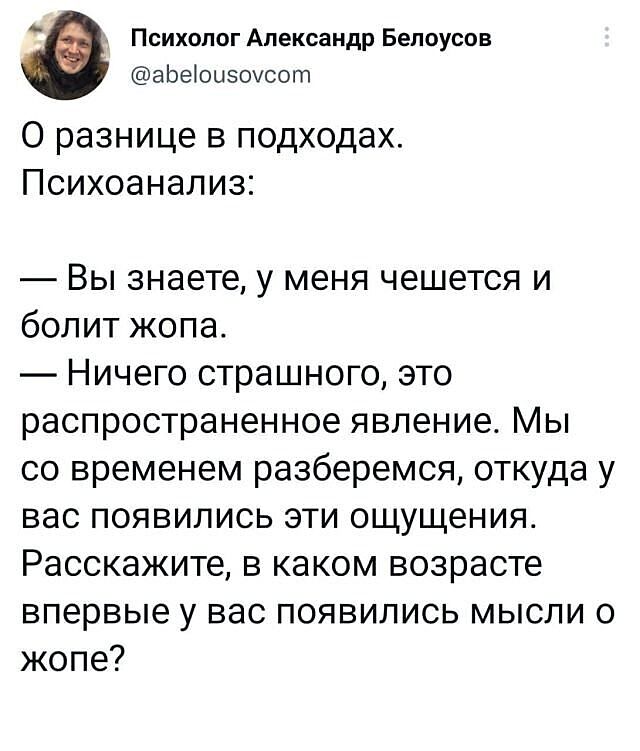 Кстати, ещё много стереотипности восприятия. Например, психоаналитическая терапия в моем опыте это совсем не упрощённое осознание и корни ид детства - куча других процессов в терапии происходило, о детстве явно меньше, чем о том, что сейчас.