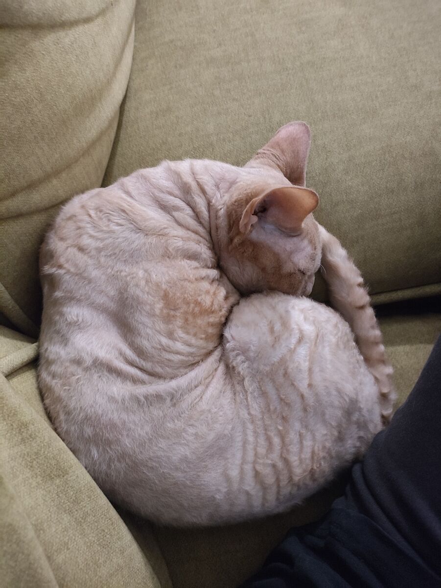 никогда не думала, что у меня будет голенький кот. Не отходит от меня, очень дружелюбный к собакам и другим котам. Нашла его на трассе... шел ободранный, и как трафарет худой. Очень любит обнимать, спать рядом, сидеть. Назвали Семеном
