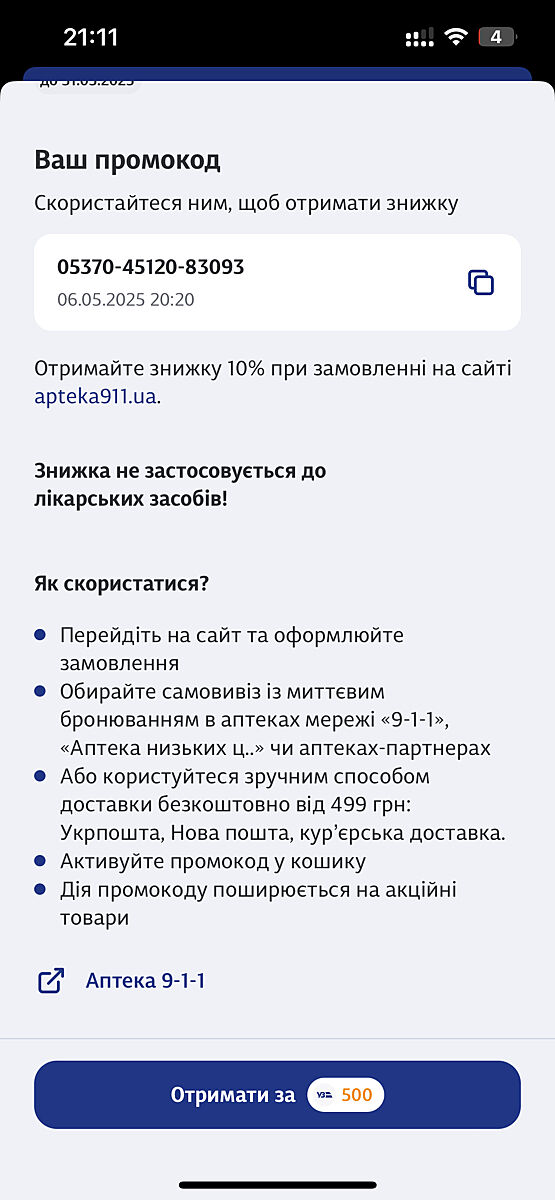 Поделитесь поомокодом в аптеку 911 пожалуйста.