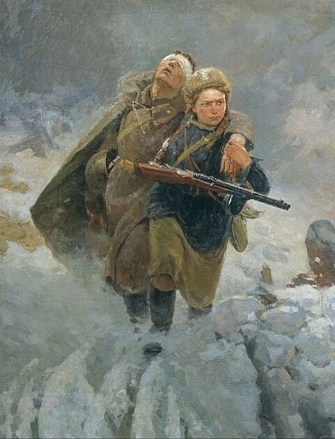Какое ружье? Она медсестра, не видели фильмов военных? Она сквозь грязь и дождь тащит на себе раненого окровавленного бойца через поля и леса. А вокруг свистят пули, дроны, все небо изрезано как в звёздных войнах.