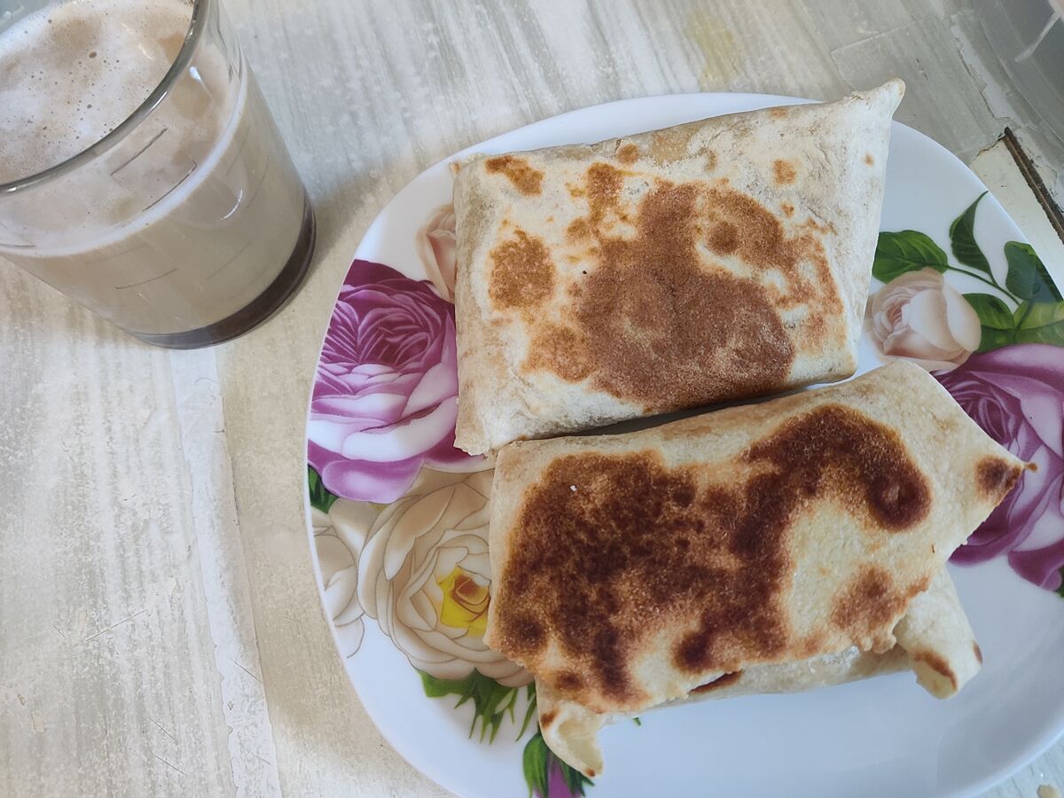 пюре, куринная ножка, бутер с намазкой с сырка, блинчик с творогом к чаю