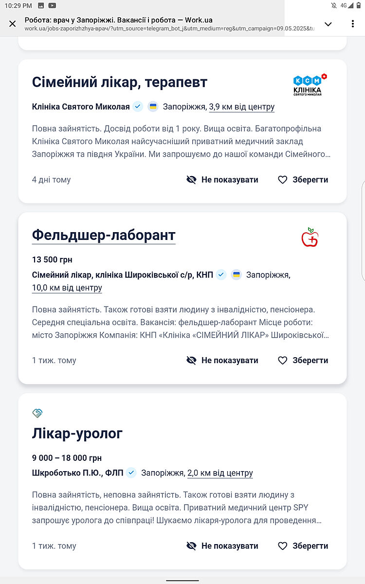 А я смотрю вакансии врача в Запорожье. И это жить под кабами,шахедами и ракетами каждую ночь.