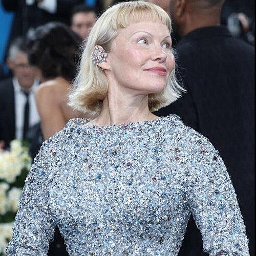 Памела Андерссон на красной дорожке Met Gala 2025. На днях обсуждали. Заплевали и стрижку, и Памелу)