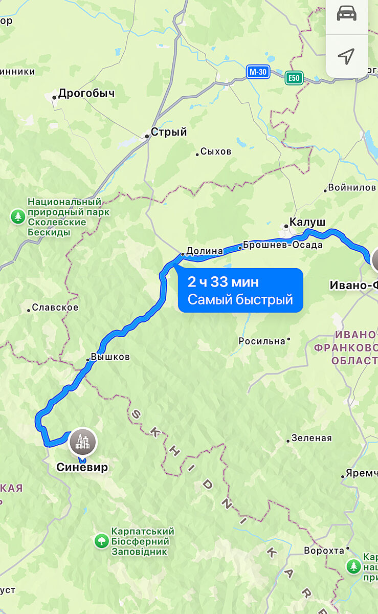 Потрібно від Івано-Франківська до Синевіра. Там якраз гори.
