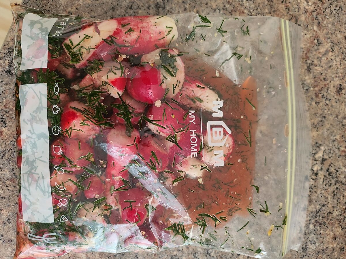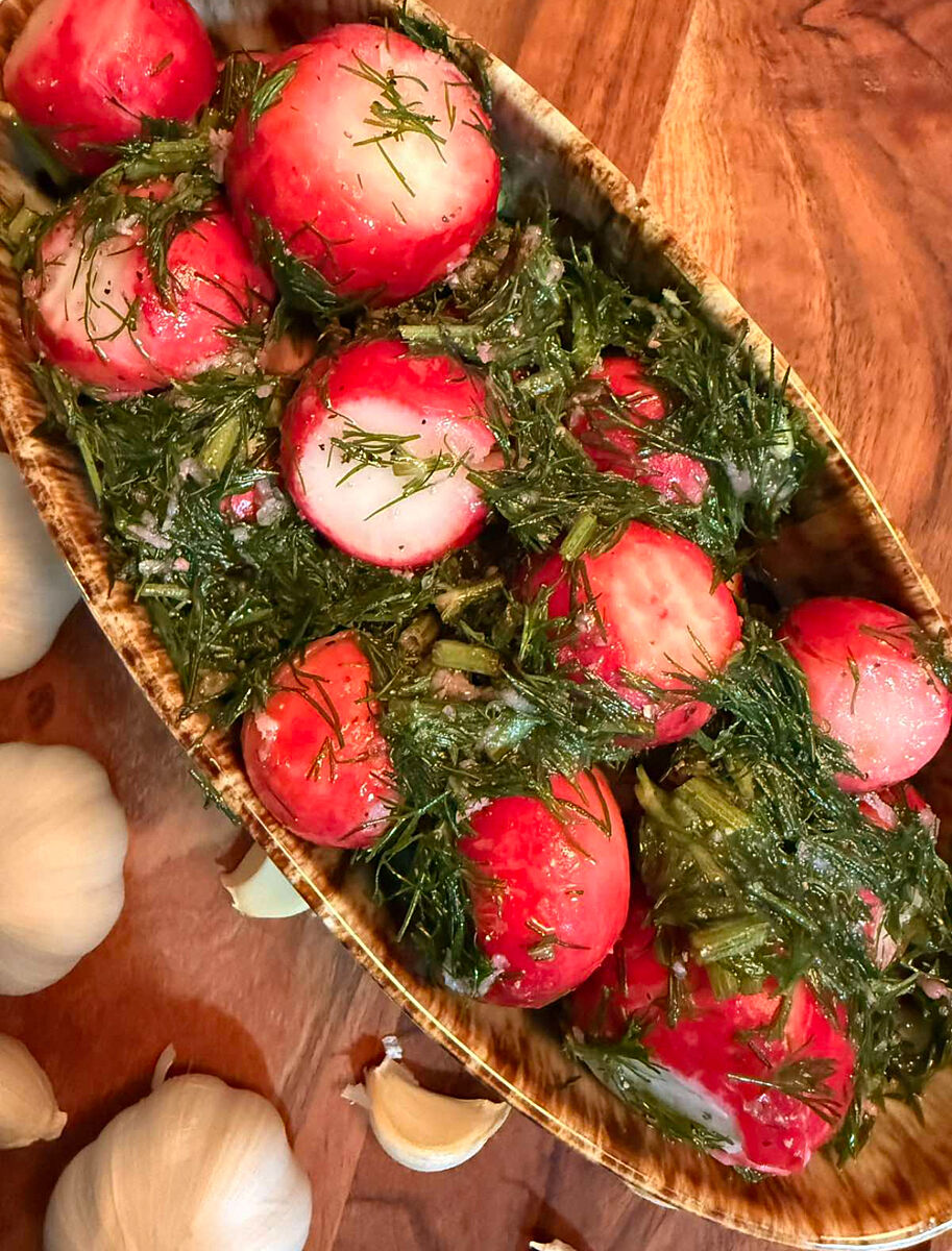 Редисочку без хвостиков разбиваю-расплющиваю. Складываю в контейнер с защелкивающейся крышкой. Добавляю соль, сахар, яблочный уксус. Все по вкусу. Обязательно давлю туда пару зубчиков чеснока. Можно добавить лук колечками, если любите. Все перемешиваю, закрываю крышкой и минут 20-30 все маринуется, периодически потряхиваю. Потом открываю, сливаю образовавшуюся жидкость, добавляю зелень и растительное масло, оливковое или подсолнечное, какое есть дома. Из зелени мне вкуснее всего с кинзой, мужу с петрушкой и базиликом. Попробуйте, это правда очень вкусно.