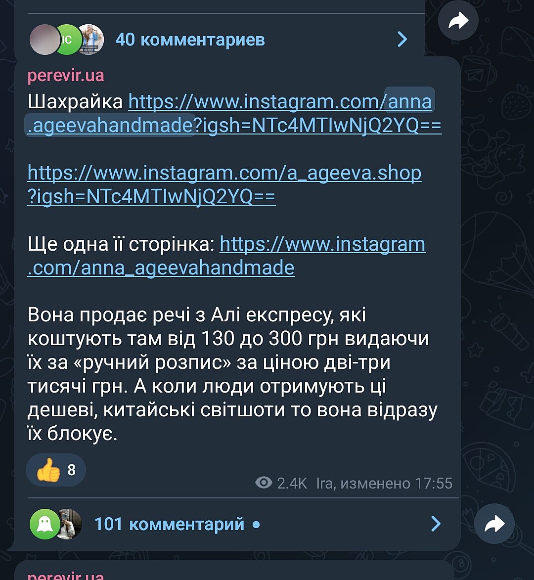 Автор, в тг и инстаграм есть девушка Ірка перевірка. Напишите ей со скринами. Она может помочь шуму наделать и деньги вернуть. У неё в тг я и читала про эту псевдохудожницу.