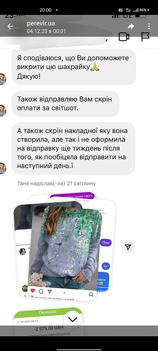 Якось давно підписалася я на художницю, яка займається розписом одягу. Ось недавно попався мені на очі світшот з дуже гарним розписом. У пості все здавалося так, ніби світшот готовий до відправки, але, як виявилось, насправді його ще немає — треба замовляти і чекати. Ок, нема питань, замовляю, даю передоплату 50% і чекаю. Проходить 10 днів, обумовлених раніше, але мені ніхто нічого не надсилає. Я чекаю — може, хтось щось напише, але тиша. Пишу сама — то отримую відповідь, що відправлять найближчим часом. Звісно, що знову нічого не відправили. Так проходить місяць. Пишу: якщо замовлення немає — то верніть гроші. Отримую відповідь, що кравчиня хворіла, тому така затримка, але повернути гроші вони не можуть, бо замовлення вже готове, і розпис сохне, і найближчим часом відправлять. І знову — тиша.