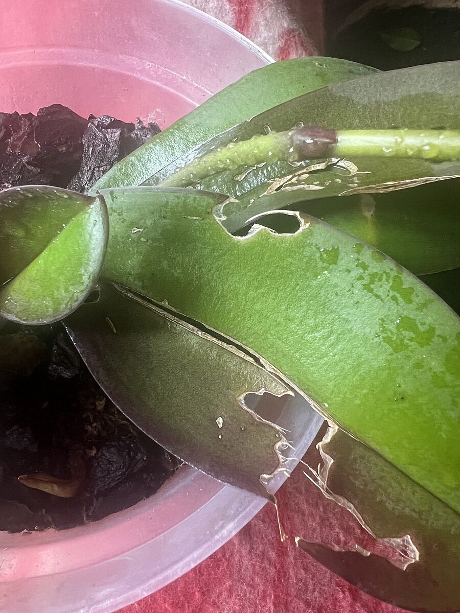 це у вас механ.пошкодження. я займаюсь орхами більше 10 р. це не кліщ,не тріпс, не червець. на слимака схоже 99%