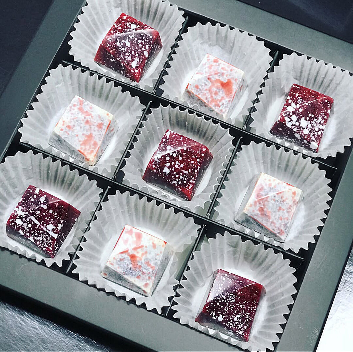 різні ганаші на основі білого шоколаду і фруктових пюре, конфі. манго маракуйя був моїм фаворитом)