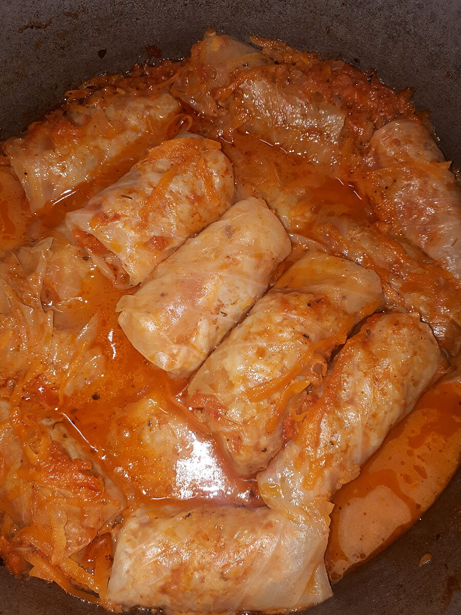 Лук и морковка, заливку не делаю, томат кладу в начинку. Голубцы чем жирнее мясо, тем вкуснее.