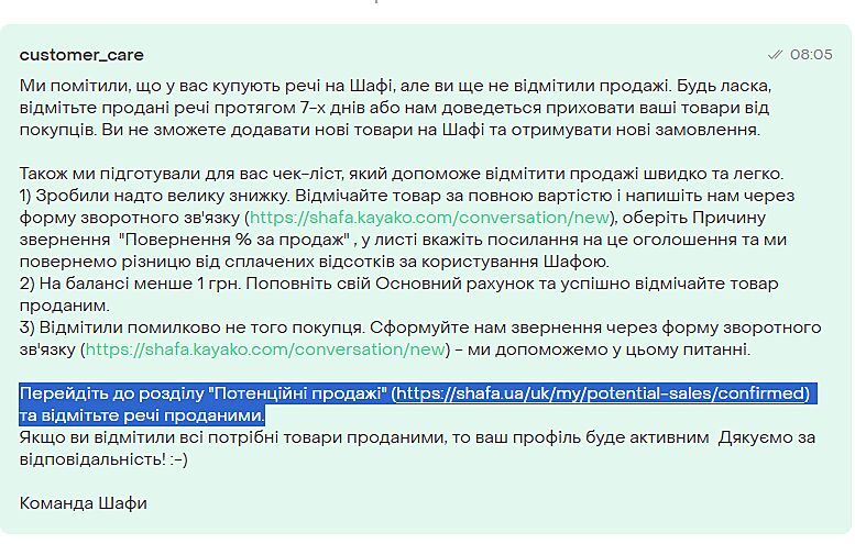 Ось я перейшла за цим лінком ’потенційні продажі’ і відмітила товар проданим після поповнення рахунку. Кошти зняли миттєво, а товар висить в статусі ’деактивований’( Отаке неподобство знову.