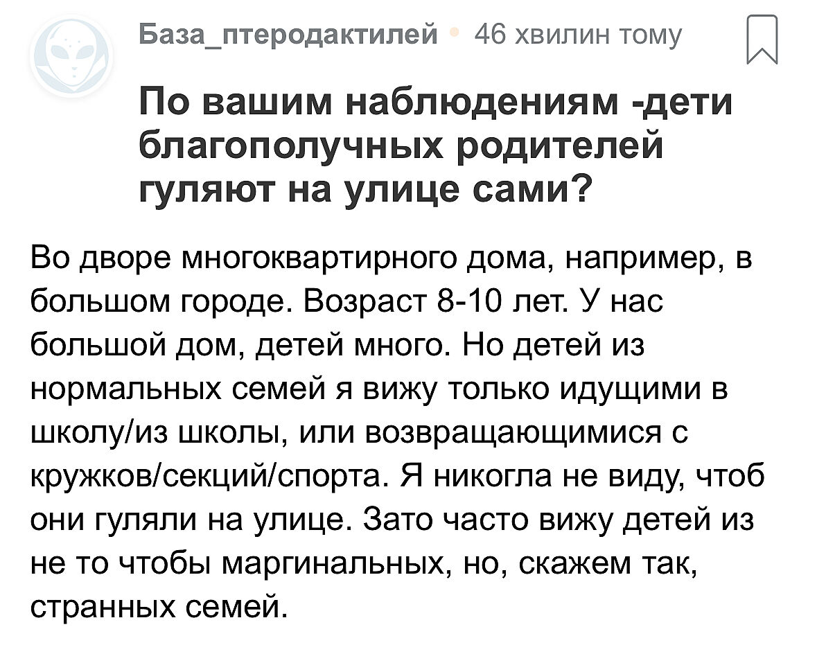 Я не кажу, що тільки діти маргиналів. Але як мені назвати батьків, якщо вони наче нормальні, працюють, нормально розмовляють і поводяться, але їхня дитина гуляє сама у дворі, коли темно вже і ніхто її додому не кличе?