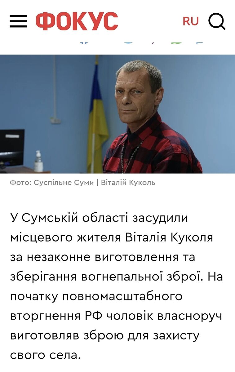 У Сумській області засудили місцевого жителя Віталія Куколя за незаконне виготовлення та зберігання вогнепальної зброї. На початку повномасштабного вторгнення РФ чоловік власноруч виготовляв зброю для захисту свого села.