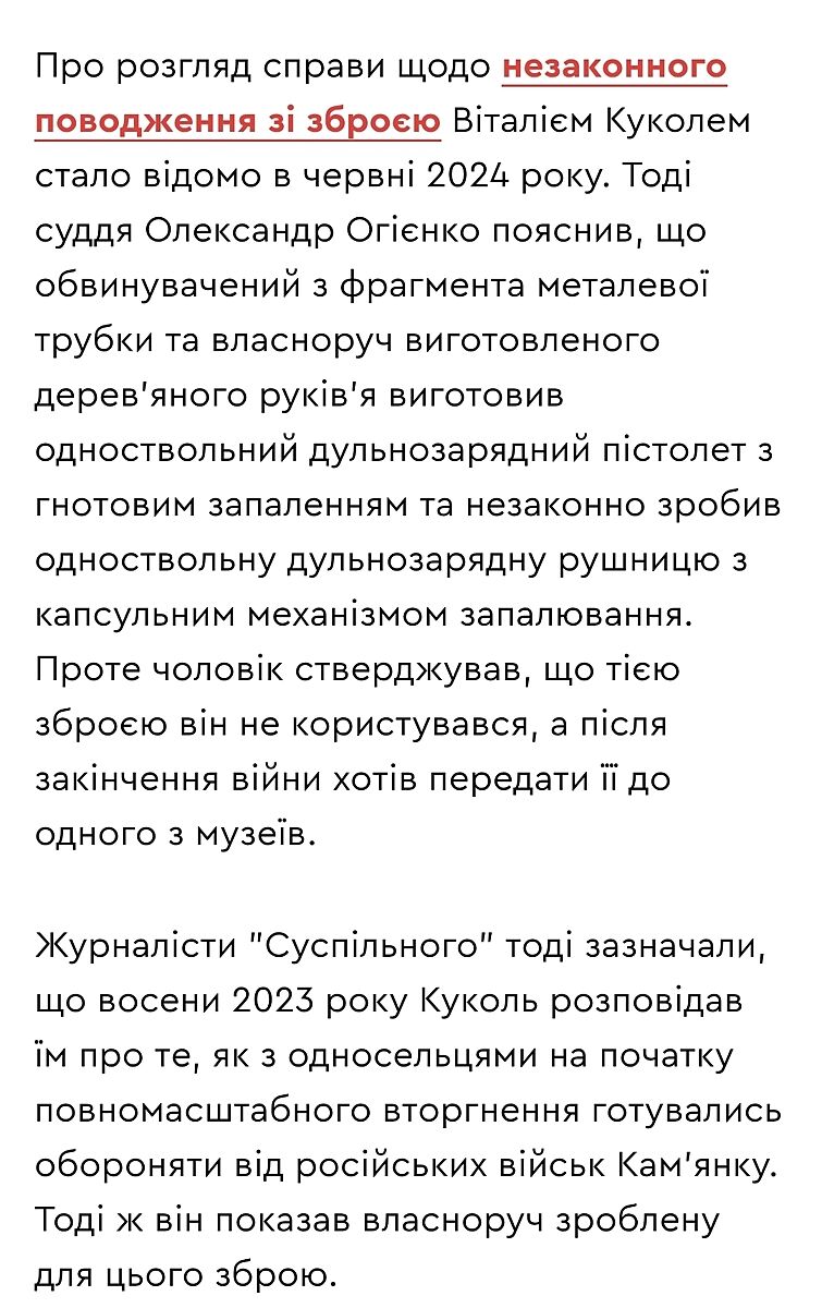 Видання зазначає, що суд визнав його винним у незаконному поводженні зі зброєю, бойовими припасами або вибуховими речовинами. Віталію Куколю призначено покарання у вигляді трьох років позбавлення волі та звільнено від відбування покарання з випробувальним терміном в один рік.
