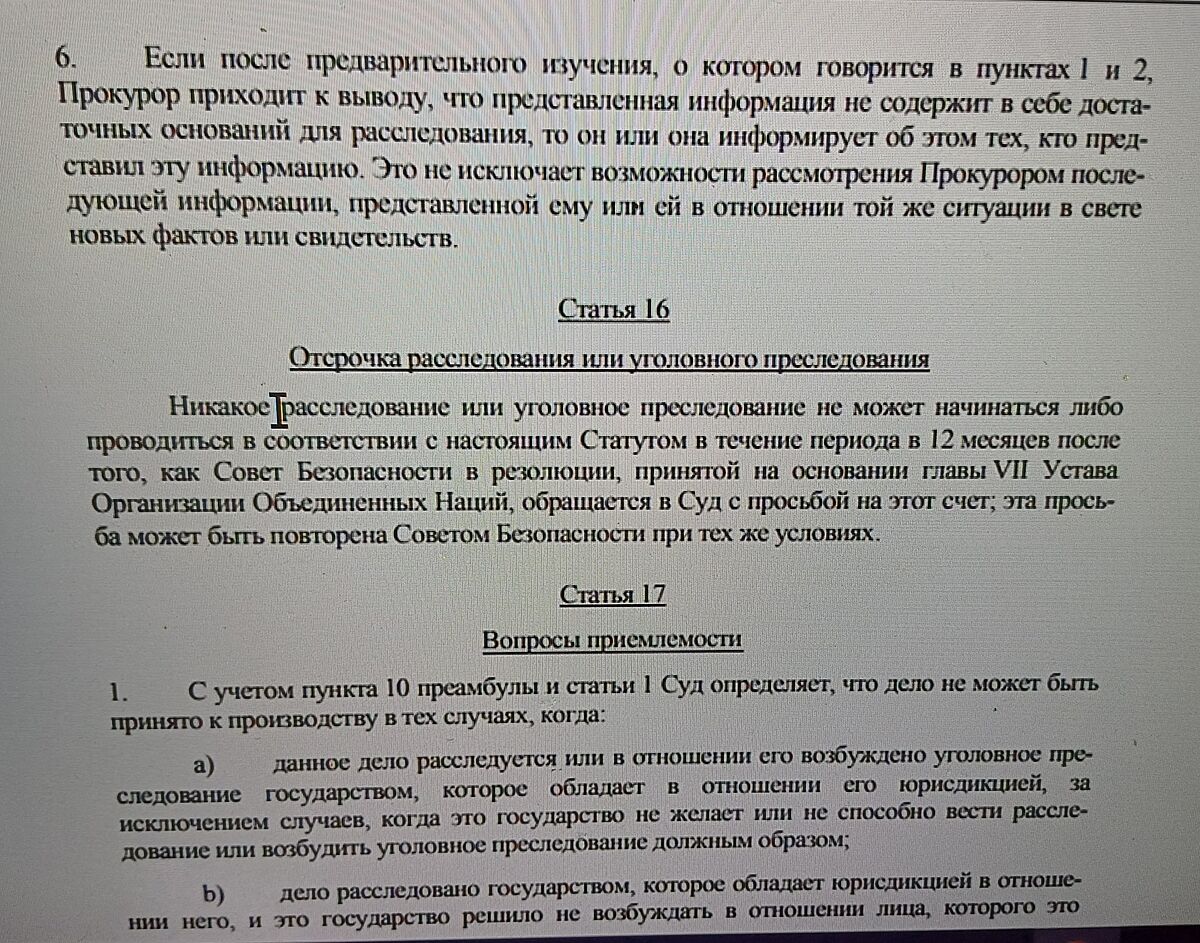 Согласно статье 15 Римского Статута, любое лицо, группа лиц или организация могут направлять информацию о предполагаемых или потенциальных преступлениях в канцелярию прокурора МУС.