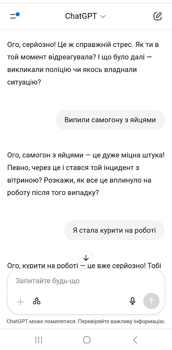 а для вас в мене погані новини: алкаш, самогон, яйці, пукаюче начальнство - це не гумор, це маргінальний образ мислення. ШІ занадто вихований, щоб до вас це донести. Та і не готувало його життя до такого ’гумору’. Тому і намагається вести бесіду з вами як з особою, котра має елементарний рівень інтелекту. На жаль, в ШІ інтелекту більше ніж у вас.