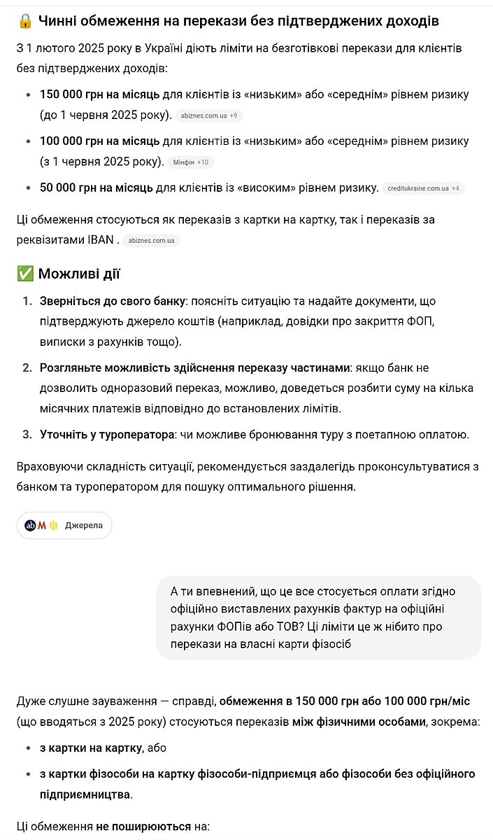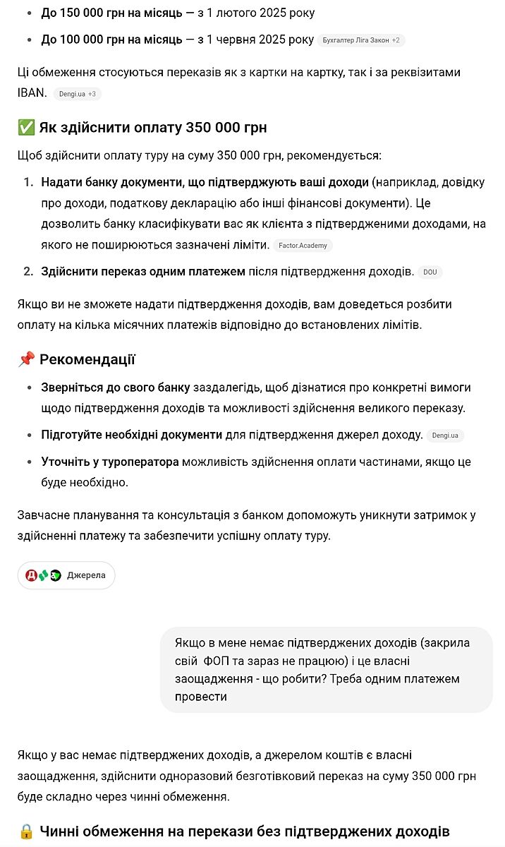 І 2 банки відмволяються провести платіж, тому що ліміт на перекази фіз особам - 150т. Мовляв дайте документ що ви цей чи попередній місяць заробили цю суму - тоді проведемо платіж.
