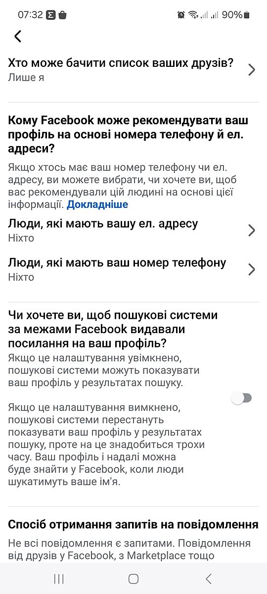 Сразу не разрешайте доступ к контактам. Меня и мне никого не рекомендуют, доступ к контактам у приложения закрыт.