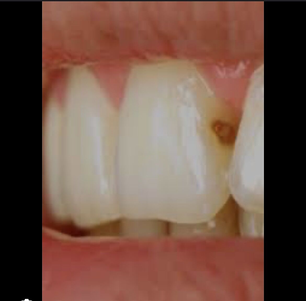 У меня выходит как разьем между передним зубом и тот что прикасается к нему такое пятнышко как ушко иголки(