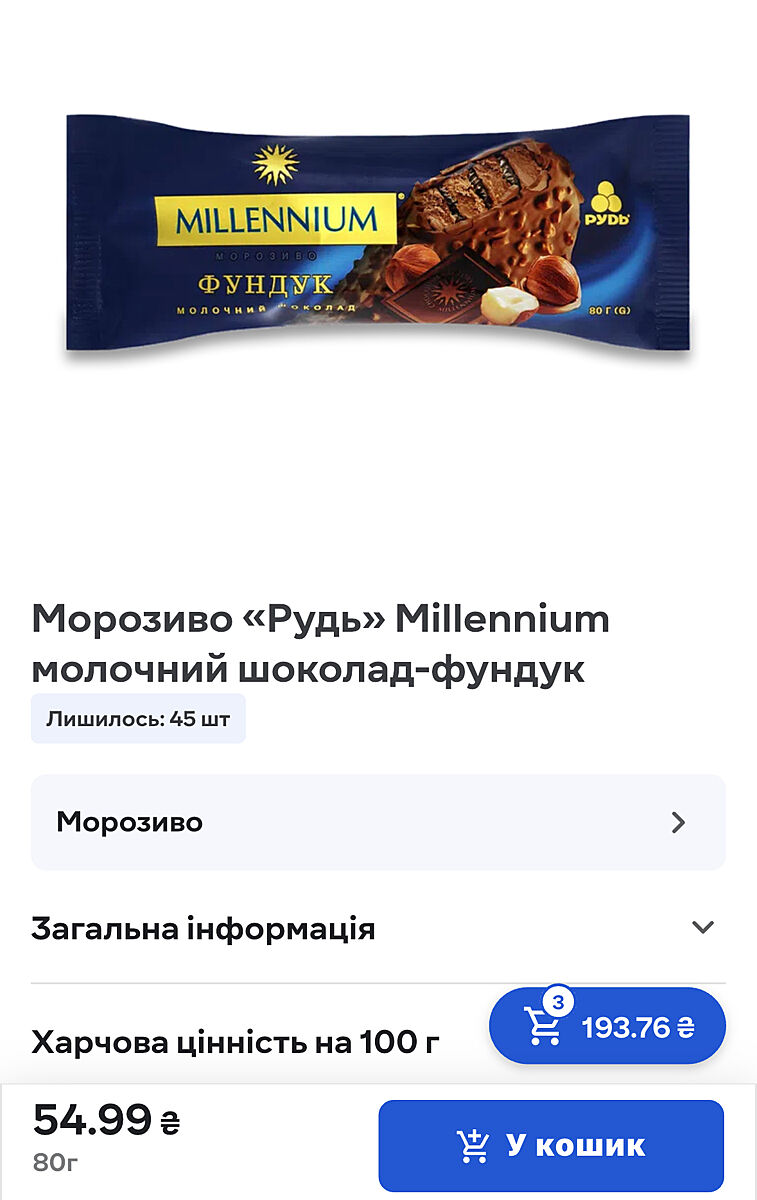 Сегодня в Сильпо купила новое мороженое миллениум с нугой, карамелью и арахисом (фото 1). Вкус у него какой-то противный, не знаю из-за чего и само мороженое такое себе, не советую. Также попробовала миллениум с фисташкой и малиной (фото 2), настолько яркая кислинка, что фисташки и самого мороженого не чувствуется. Вряд ли ещё куплю такое. Самое лучшее на данный момент для меня миллениум молочный шоколад-фундук(фото 3). Ещё было самое вкусное миллениум с апельсином в черном шоколаде, но его по неизвестной причине сняли с производства.