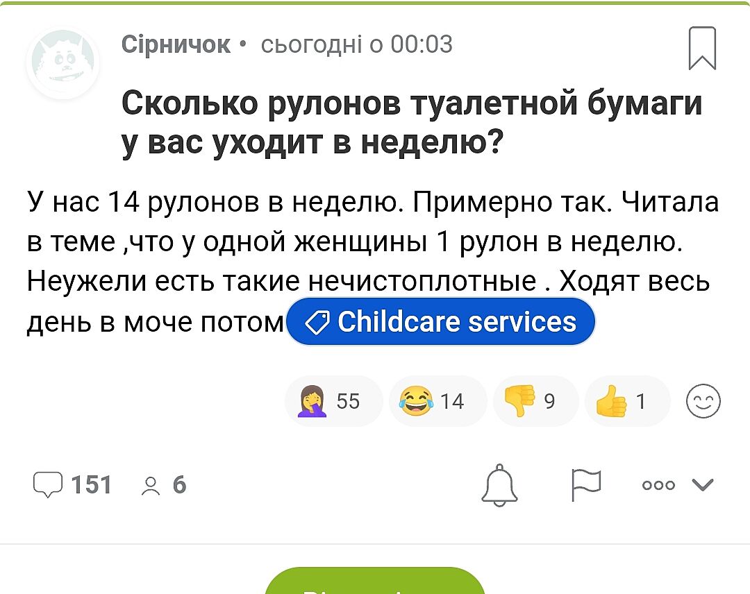 Ну вам не всерівно хто скільки використовує туалетного паперу. Зараз почнемо виміряти сантиметром. Мені здається, що вам немає чим корисним зайнятись