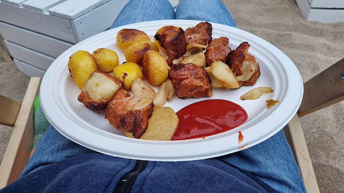 Простой ужин. На мангале скумбрия. Пару картошинок , салатик.