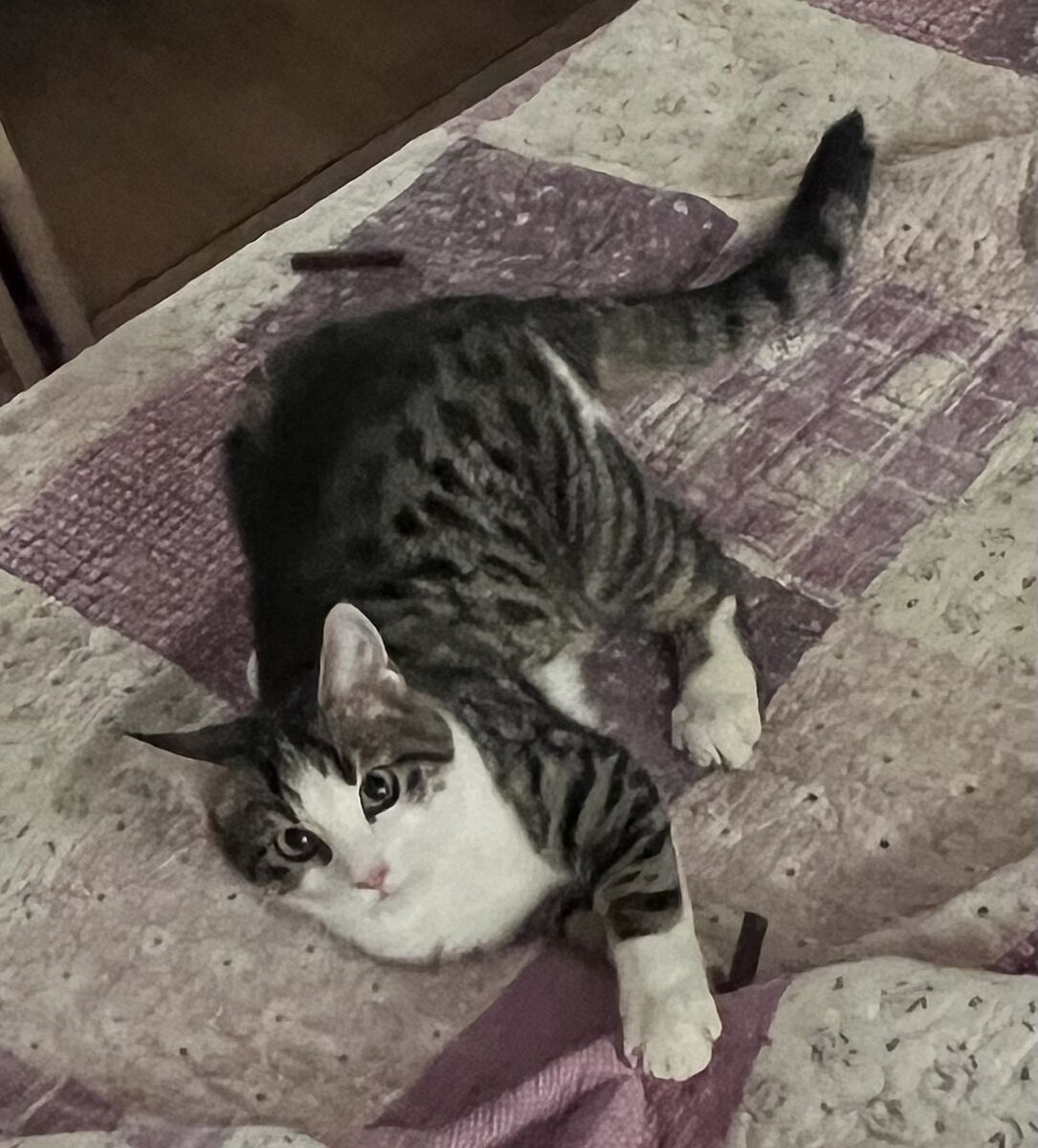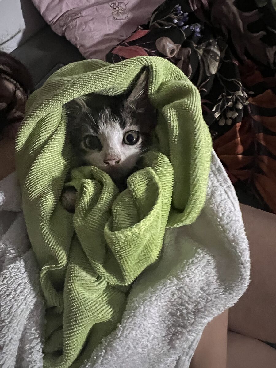 Вам ребенок принес, а мне муж) Пошел выносить мусор и притащил малюсенького котенка месяца полтора. Дома уже два кота было. Отмыли котейку и пристроили.