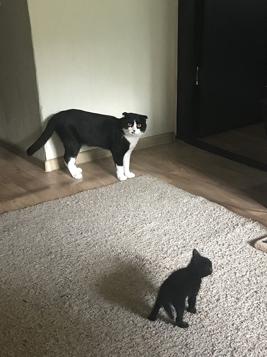 Останній кіт,заїжджаю після роботи на подвірʼя,було після 23,сидить на порозі рижик,місяці 1,5-2.Забрала,помила,були краплі від бліх,то на наступний день блохи сипалися в миску з водою.Так і прижився,ще з старшим котом,дякувати Богу британець спокійний,як удав.