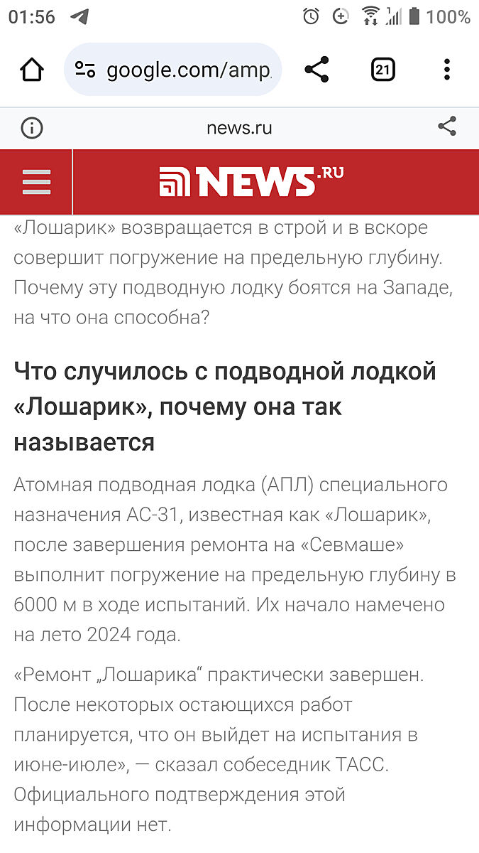 АС-12, відомий також як «Лошарик» — російський глибоководний атомний підводний човен (за офіційною російською військово-морською класифікацією — атомна глибоководна станція), який не містить озброєння і здатний занурюватися, за деякими даними, на глибину до 6000 метрів (було продемонстровано занурення апарату на ...і далі по ВІкі.