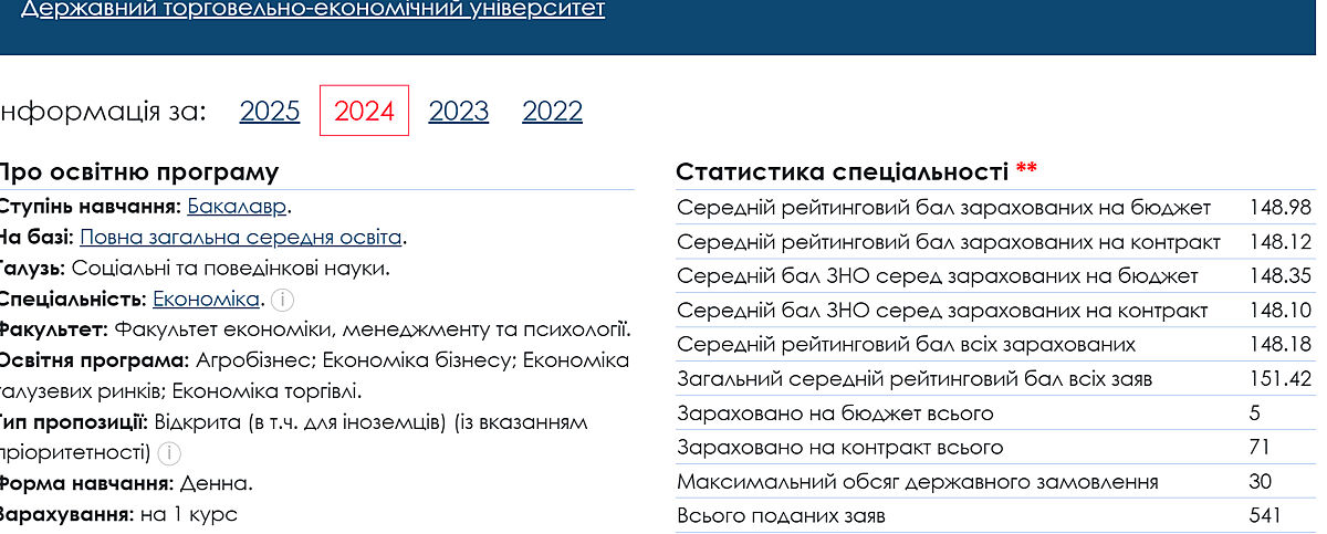 Та ні бюджету там не 100 буде по факту, там максимальний обсяг на бюджет 30 місць, і їх внз не отримає. Зараз же широкий конкурс і там весь бюджет за квотами заняли. А ось на контракт мінімальний бал був 120 у 2024 на економіку в ДТЕУ