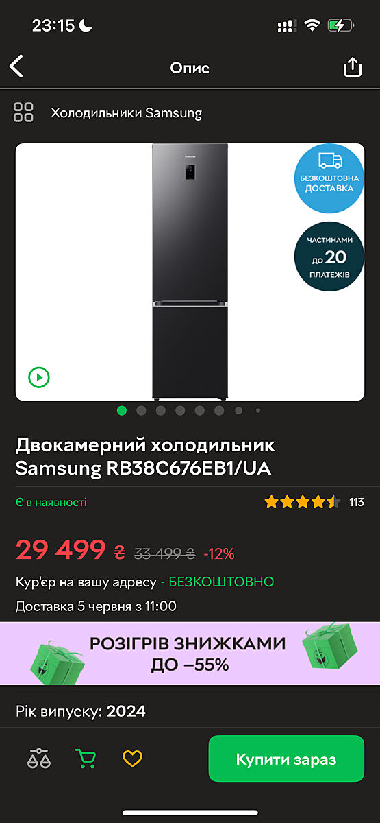 Коли я купувала, був дешевий. Але син моніторив уцінку в Розетці та купив на 6 тисяч дешевше. Причиною уцінки була маленька вмʼятина внизу з боку, який прилягає до стіни та її тепер не видно.