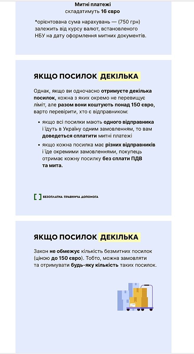 Как повезёт. Если переживаете или большой перелимит, то когда 1 посылку уже выпустят с таможни. У меня была такая ситуация, много лет назад, когда только ввели лимит 150€ в день. На таможне одновременно оказалось 4 посылки. Каким чудом их пропустили и я не нарвалась, загадка. Но с тех пор не рискую.