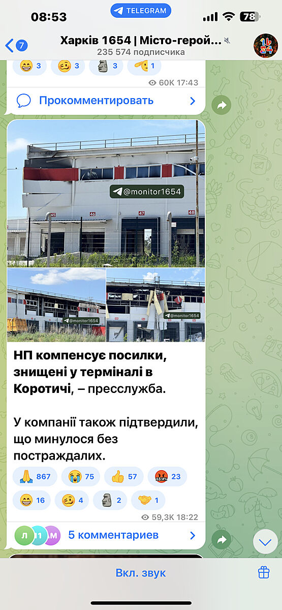 Замовляла 3 пари трусиків в Instagram-магазині, оплатила наперед приблизно 1500 грн. Магазин відправив посилку «Новою поштою», і вона прибула 3 червня в депо №5 у Харкові — саме в той день, коли туди прилетіло, як писали в новинах.