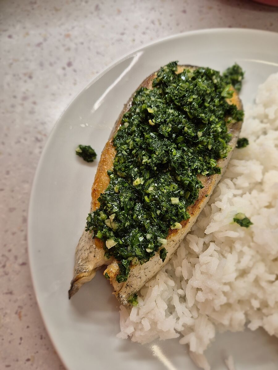 Рис и рыба с петрушкой, чесноком, лимонным соком и маслом. За кадром овощной салат