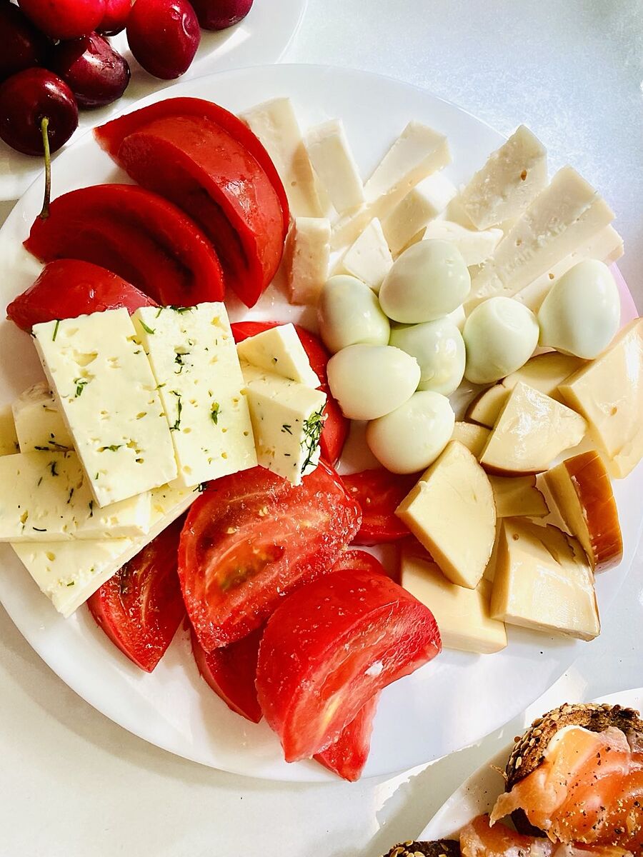 Отварная свекла и фета, заправленные оливковым маслом с греческим йогуртом. Филе рыбы запечённое. Персик. Черный шоколад и кофе на десерт.